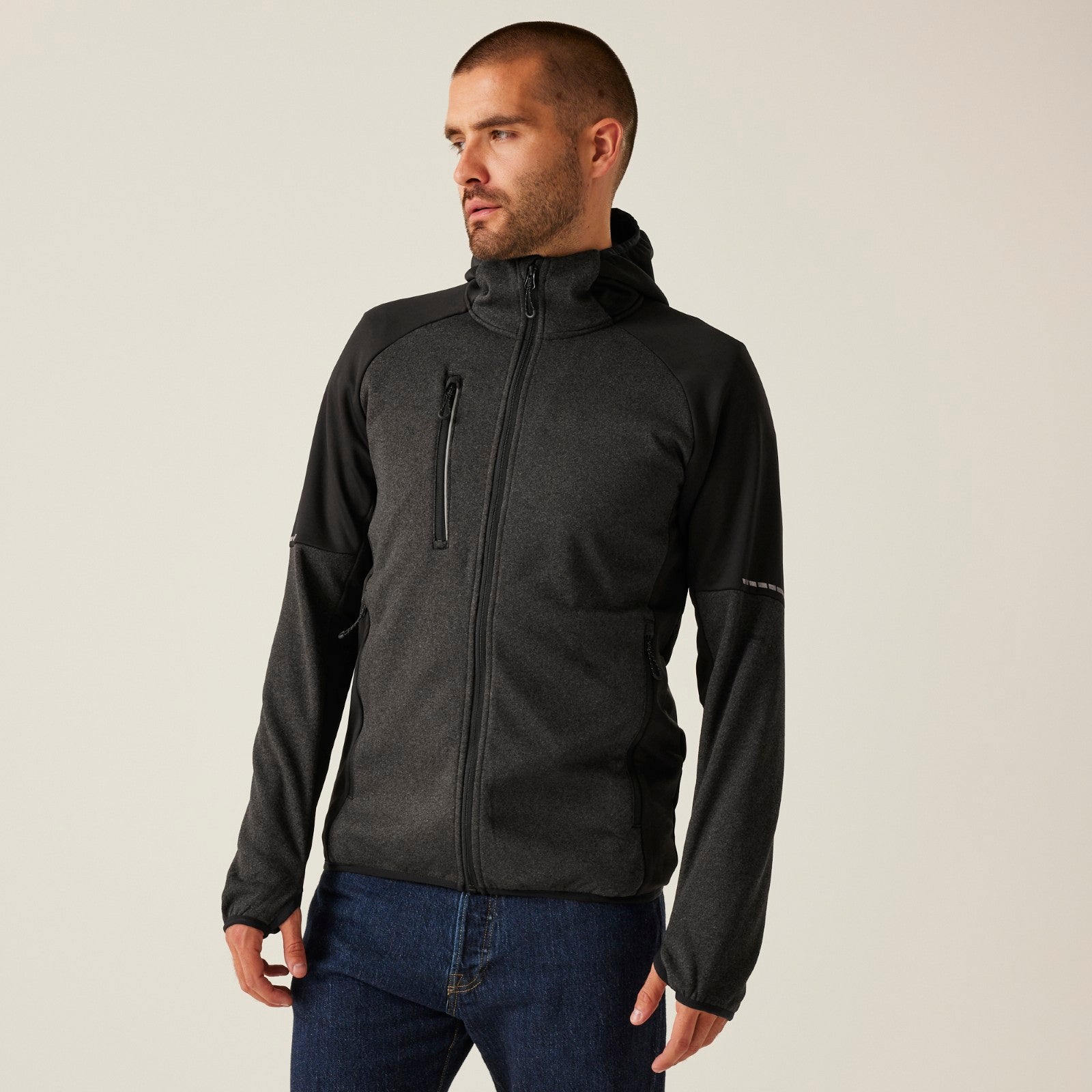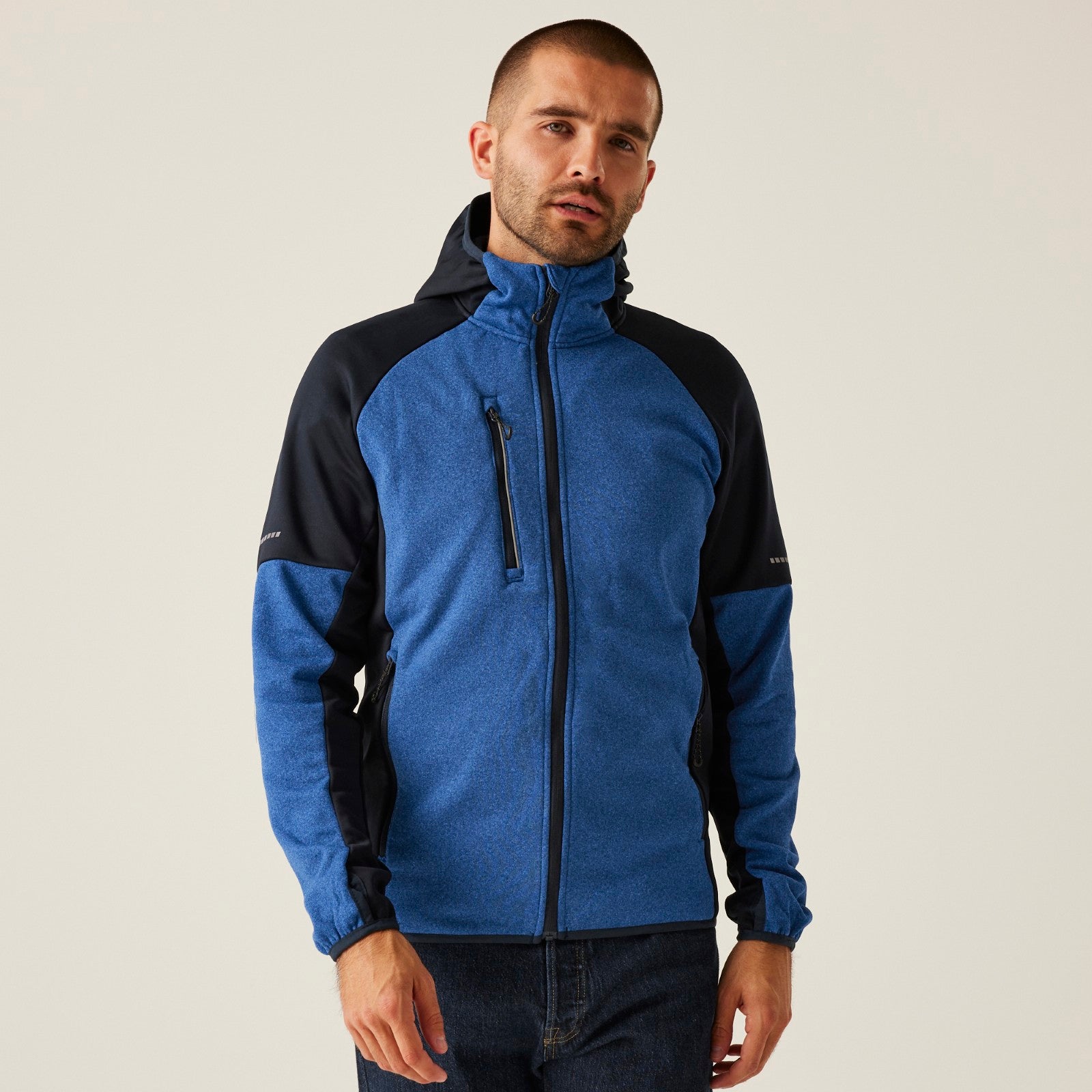 - Warm backed marl knit fleece with extol stretch sides, hood and underarm panels