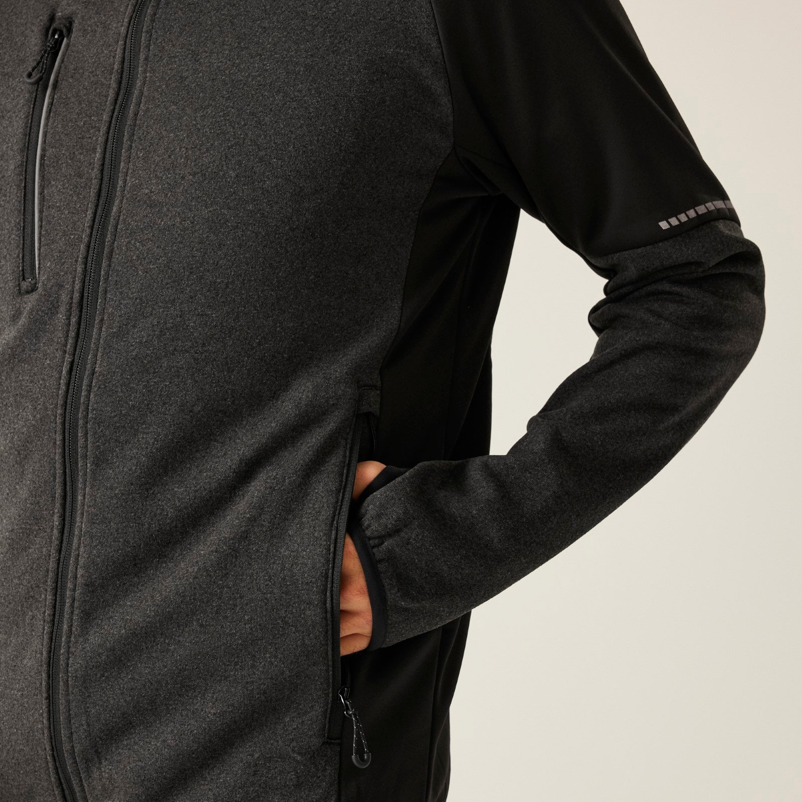 - 2 zipped lower pockets and 1 zipped chest pocket, with chin guard and reflective details