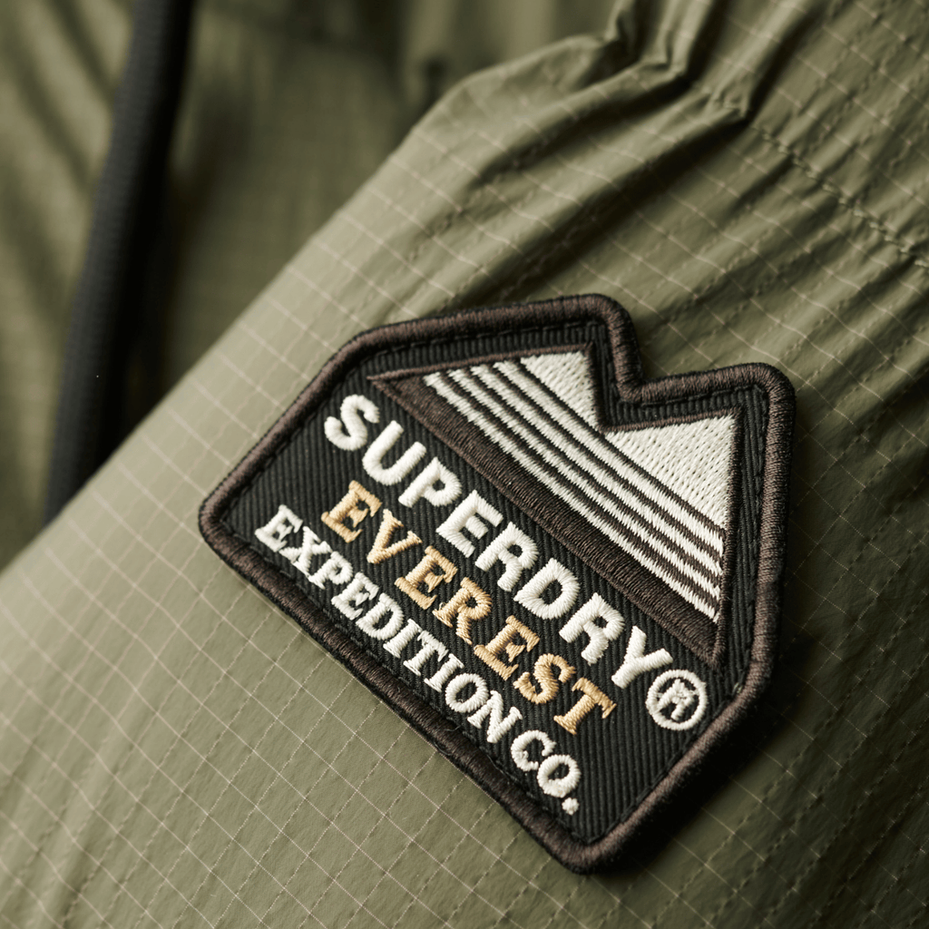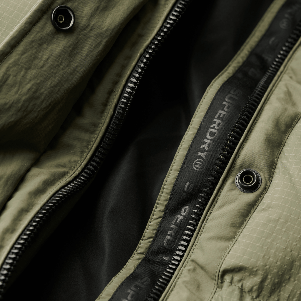 - Bright contrast Superdry rubber tag on the sleeve